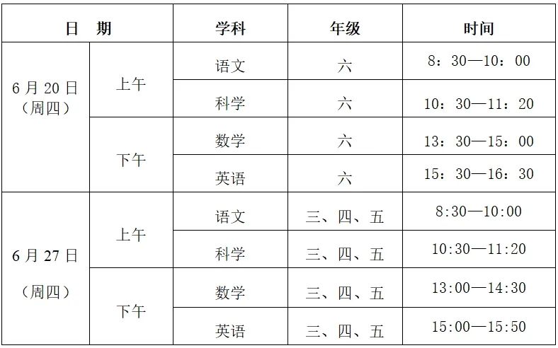 小学一、二年级:实行无纸化测试,由各校自行安排时间组织。