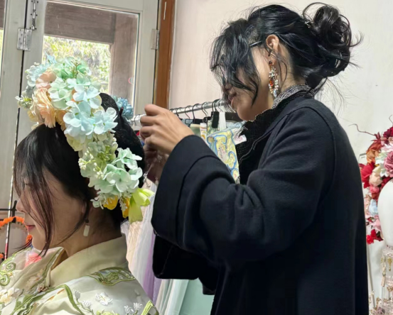 簪花不仅是一种手工技艺,更是文化的传承与表达。“因为我本人特别喜欢做手工,所以簪花全部是亲自动手做的,希望带给客户更好的体验。”蓝珊小馆采用的是手工簪花而非成品,难度较大,一件完整的成品大概需要耗费一周时间才能完成,但王小可仍然坚持用手工制作。簪花寓意深远,她将美好的祝愿融于每一朵簪花中,以求让客户享受到极致的文化体验。
