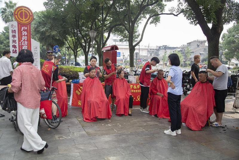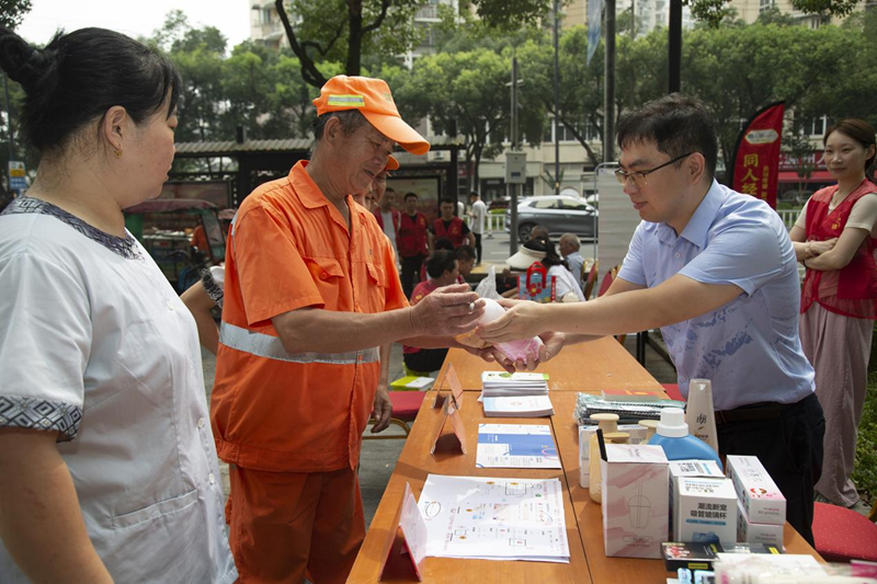 在温州工会大厦户外劳动者服务站点,志愿者们分别为执法人员、环卫工人等一线高温作业人员送上了绿豆汤、茯茶、矿泉水、凉粉等“降温”食品。温州市总工会的工作人员还为他们提供了藿香正气水、花露水、沐浴露、凉水杯等夏季防暑物资。活动现场还设置了爱心早餐、爱心义诊、爱心理发、职业健康常识宣传等摊位,为在高温下工作的户外劳动者提供了从生活到工作的全方位服务。