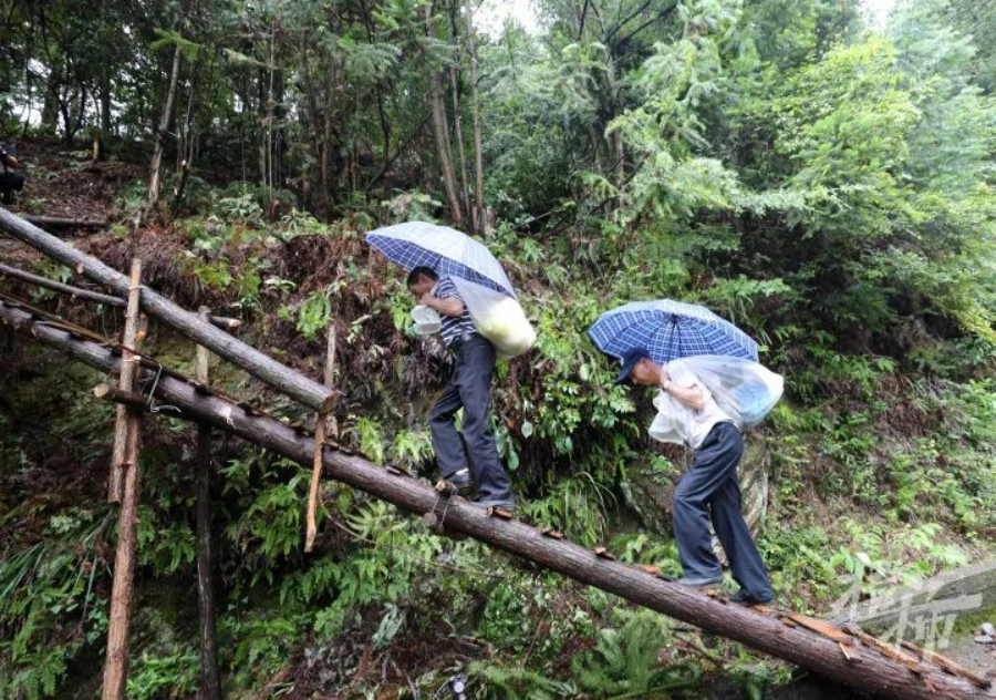 图为村干部通过“临时便道”送物资上山。