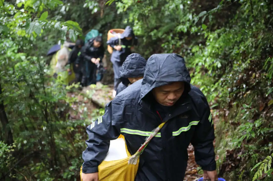 6月25日,运输队的成员们背着30到60斤不等的物资,徒步往返约十公里,沿途多处树木倒伏,古道泥泞崎岖,路窄且陡,稍有疏忽就可能失足跌倒。原本开车十几分钟的路程,他们靠双脚翻过三个山头,足足走了一个半小时。