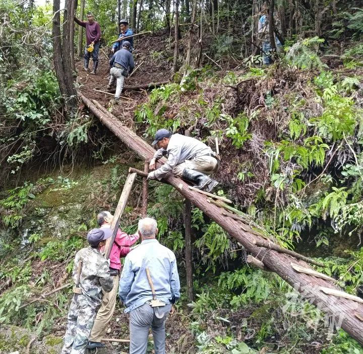 图为村干部与村民一起修建“临时便道”。
