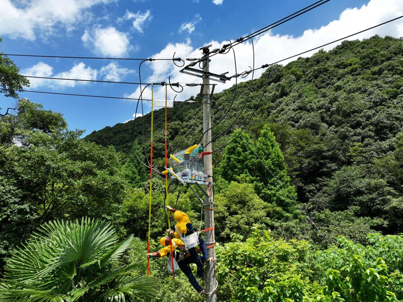 7月4日,在杭州市余杭区闲林街道桐村高烨线附近,浙江大有集团余杭分部员工运用带电作业技术对10千伏原枫H7214线21号杆加装智能联络开关,提升配网区域网架结构和自动化水平,保障迎峰度夏期间线路安全可靠运行。
