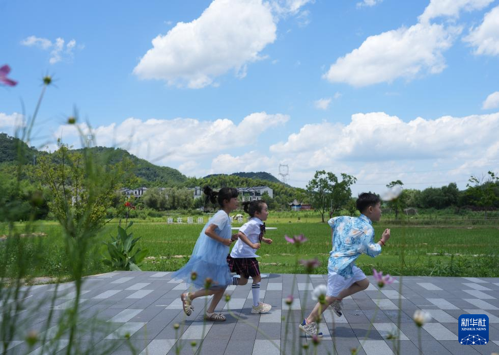 7月3日,小游客在汪巷村的田野间玩耍。