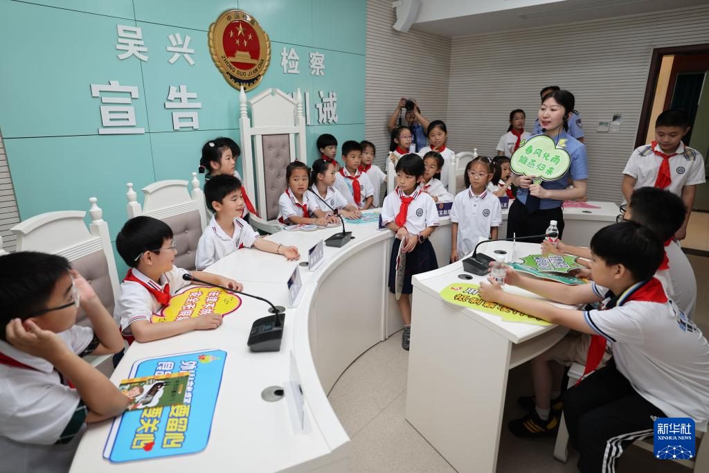 7月3日,湖州市吴兴区人民检察院检察官带领小学生参观未成年人检察办案区。