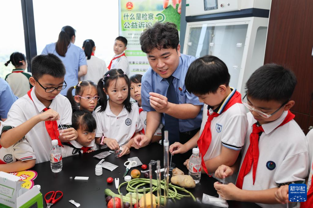 7月3日,在湖州市吴兴区人民检察院公益诉讼快速检验实验室,检察官带领小学生对蔬菜、水果进行农药残留快速检测。