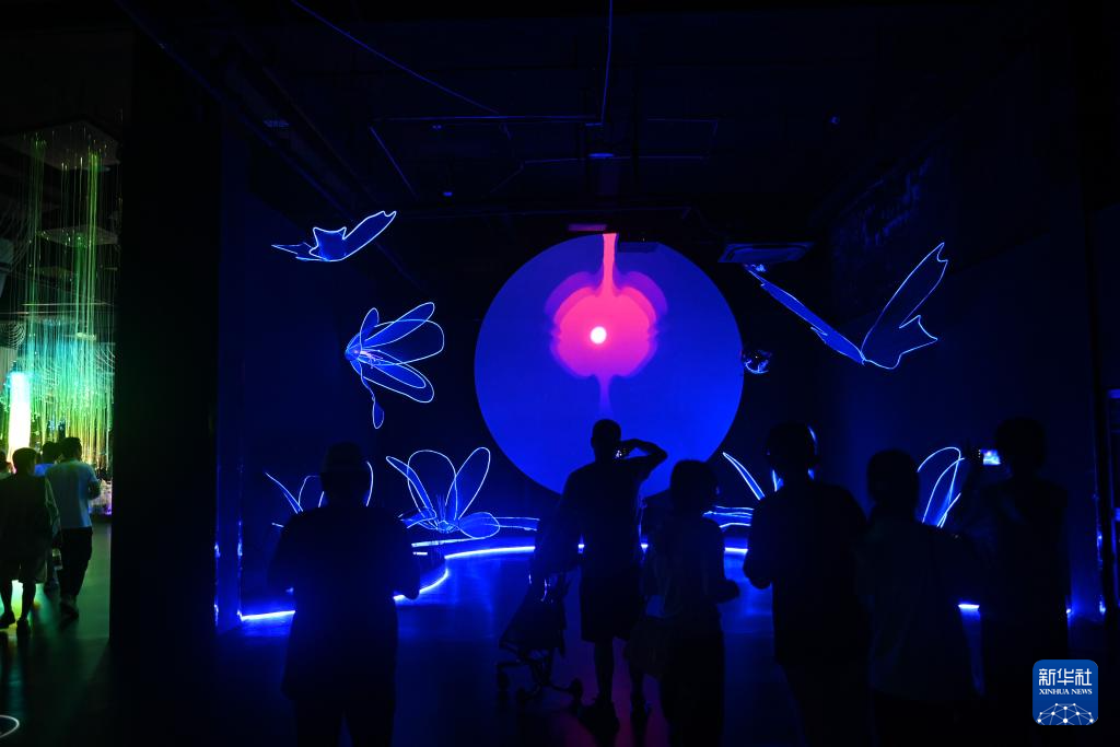 7月5日,游客在杭州宋城景区观看光影互动。