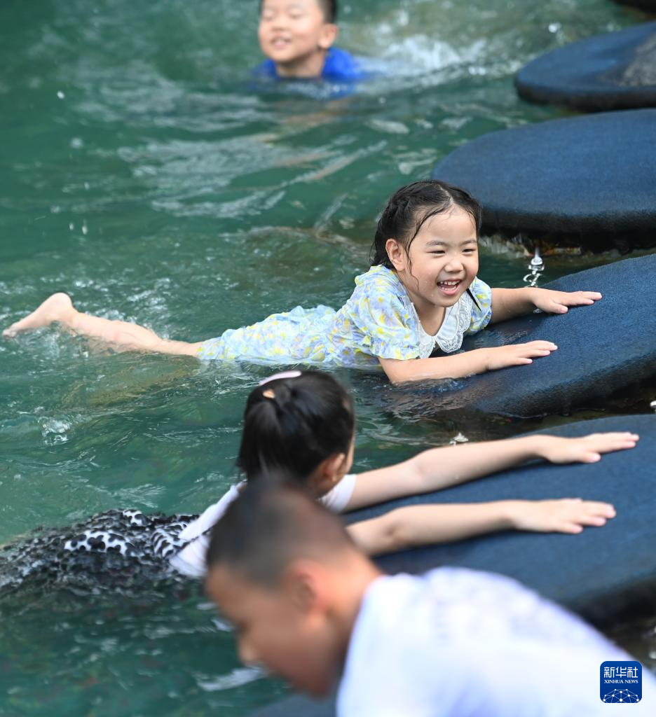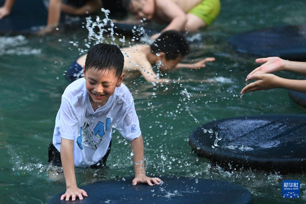 7月5日,小朋友在杭州宋城景区戏水。