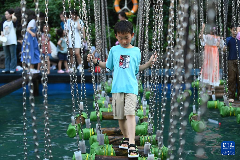 7月5日,小朋友在杭州宋城景区体验水上游乐项目。