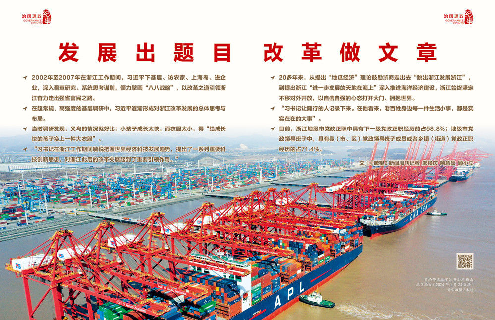 发展出题目,改革做文章。2002年至2007年在浙江工作期间,习近平下基层、访农家、上海岛、进企业,深入调查研究、系统思考谋划,倾力擘画“八八战略”,以改革之道引领浙江奋力走出强省富民之路。20多年来,浙江实现了由资源小省向经济大省、由外贸大省向开放强省、由环境整治向美丽浙江、由总体小康到高水平全面小康的历史性跃升。