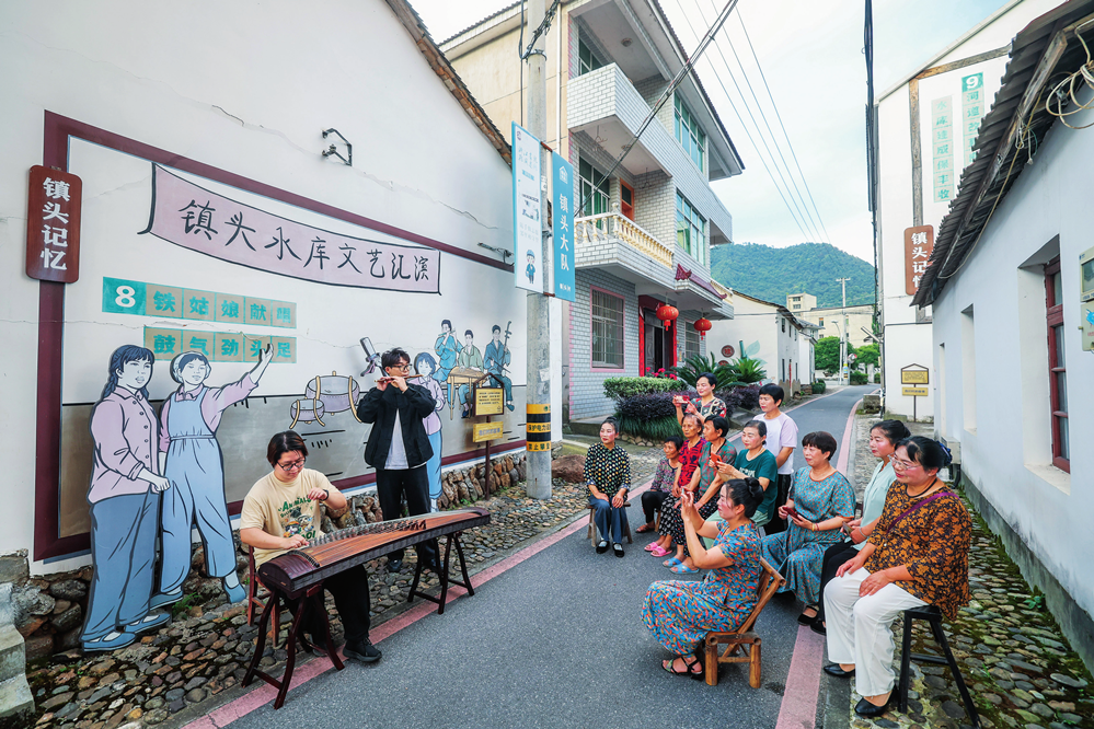 杭州师范大学音乐学院的学生在浙江省建德市三都镇镇头村为村民即兴演出(2024 年 6 月 15 日摄)徐昱摄 / 本刊
