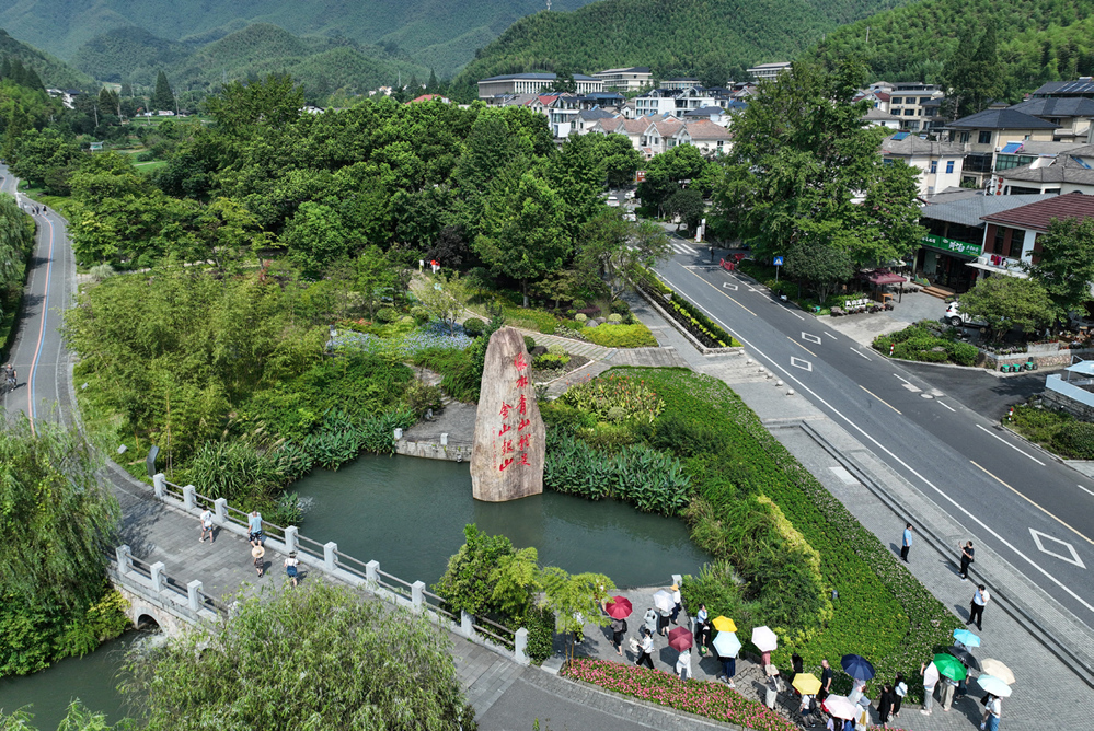 游客在浙江安吉余村的绿水青山间参观(2023 年 8 月 11 日摄)翁忻旸摄 / 本刊