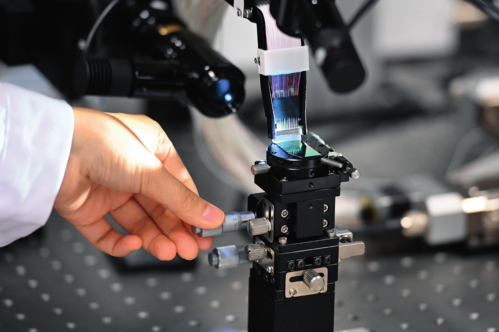 位于杭州市的之江实验室智能网络研究院的科研人员在运用自主研发的芯片光学封装技术对大规模光交换芯片进行封装测试(2022年 6 月 23 日摄)黄宗治摄 / 本刊