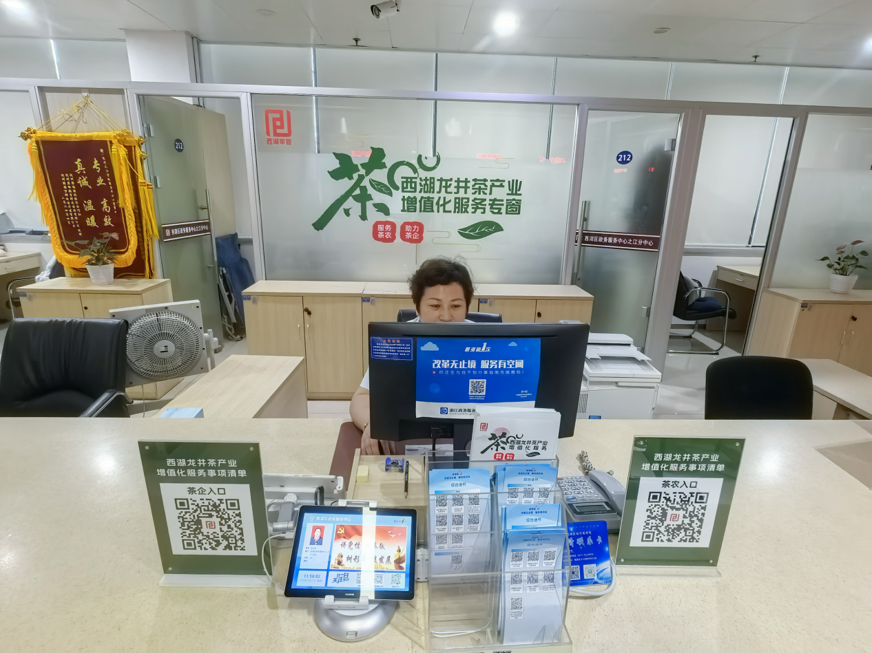 这个西湖龙井茶产业增值化服务专窗就设立在西湖区政务服务中心之江分中心,主要为茶企茶农提供全链条咨询、导办服务。