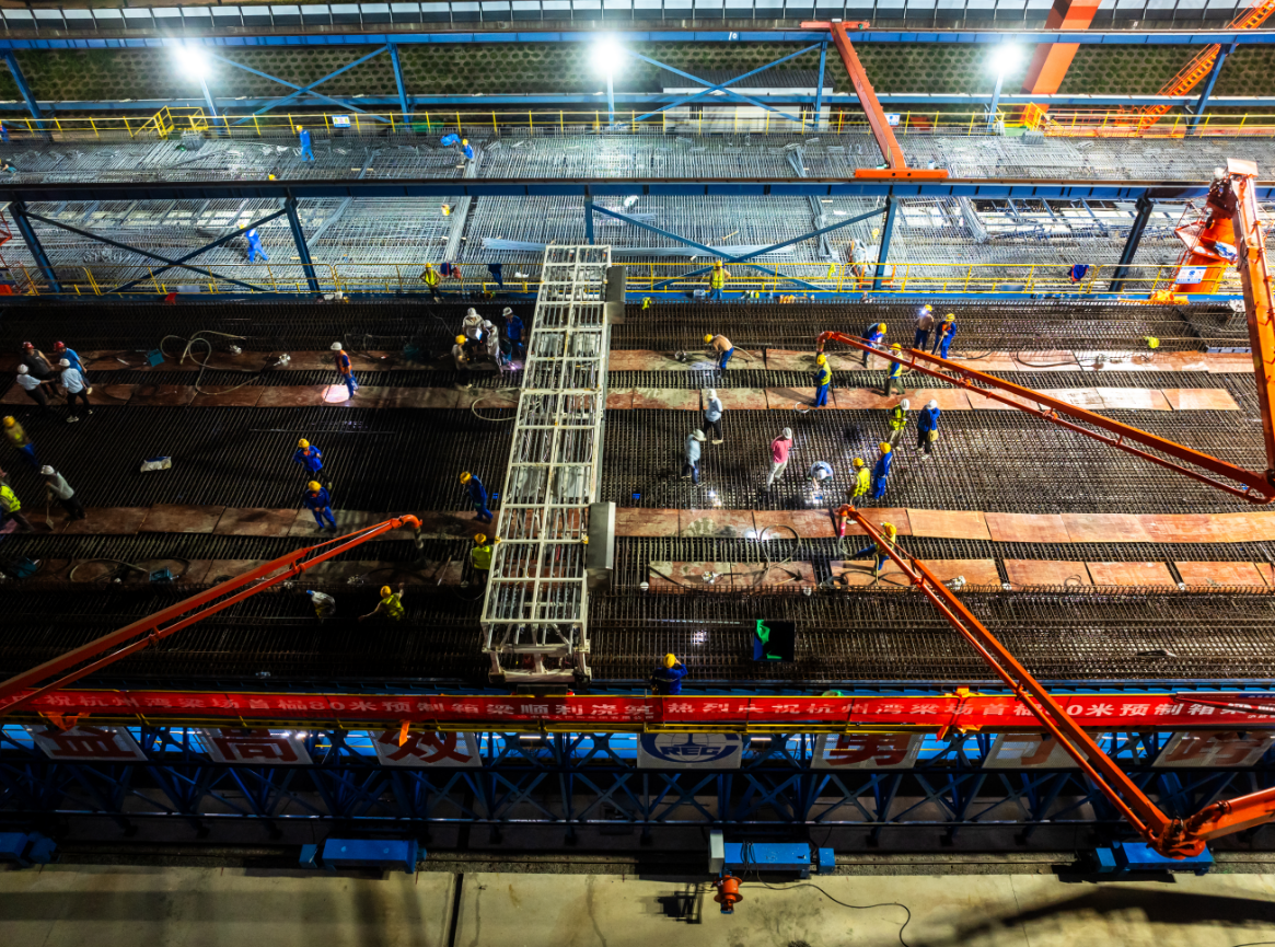 7月9日,世界最长高速铁路跨海大桥——通苏嘉甬高铁杭州湾跨海铁路桥首榀80米跨度预制箱梁开始在浙江海盐浇筑,这是迄今为止世界上跨度最大的预制混凝土箱梁,被誉为新一代“世界梁王”。