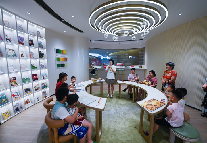 2023年7月27日,在浙江省嘉兴市南湖区余新镇渔里未来社区“向日葵亲子小屋”的母婴沙龙内,孩子们在家长的带领下参加互动游戏。新华社记者 徐昱 摄