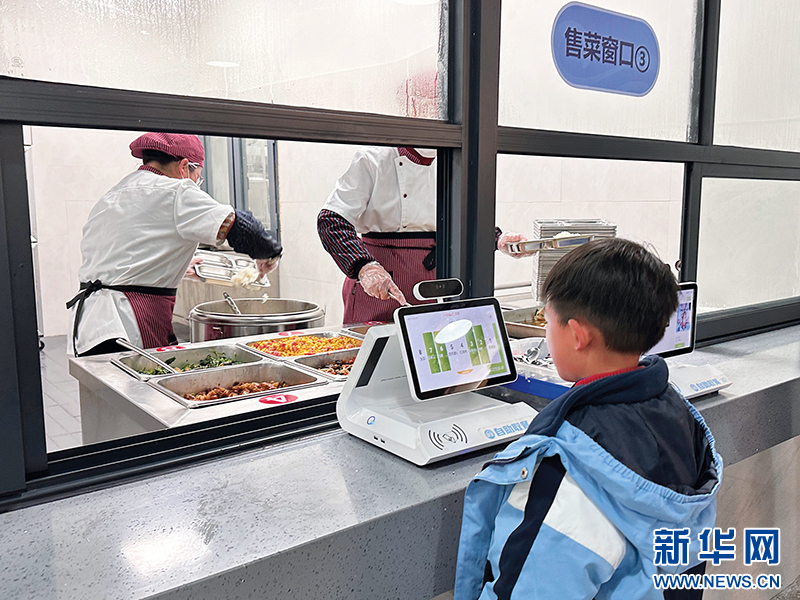 午餐时间,浙江省丽水市缙云县东渡小学学生正在智慧窗口等待打菜(2024年3月6日摄) 吴帅帅 摄