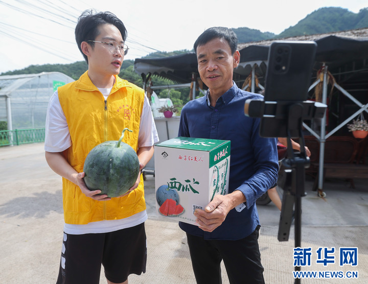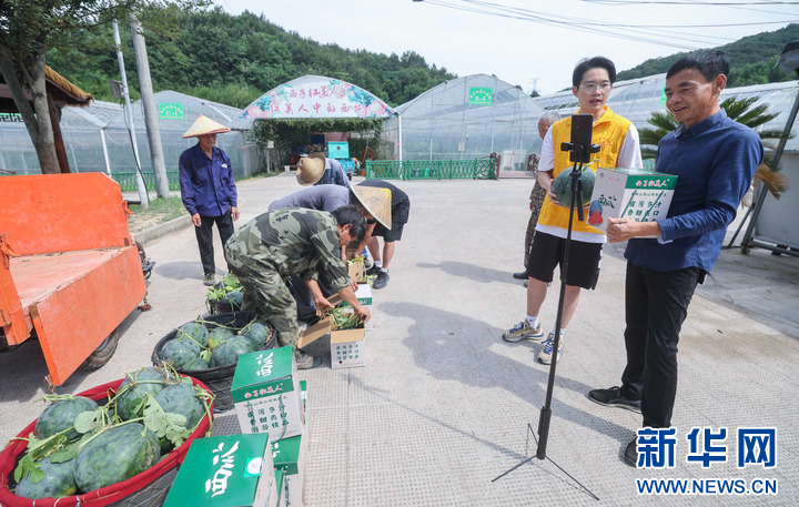 7月17日,在浙江省诸暨市安华镇勾乘山村的共富工坊农业产业园内,产业园负责人宣汉光(右)和安华镇镇干部在直播售卖西瓜。新华社记者 徐昱 摄