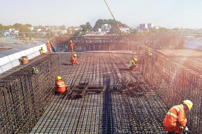 钢筋架上热浪灼人,赵新江和其他工人正进行引桥现浇箱梁钢筋绑扎工作。“钢筋绑扎这活检验人,一套动作要不断重复做,要能耐得住性子,才能把活干得漂亮,细微之处最能检验品质。”赵新江说。