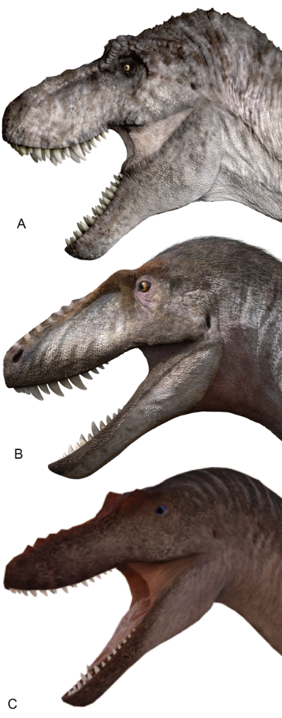 霸王龙(A)、亚洲暴龙(B)和虔州龙(C)等三种暴龙的头部复原图。前两者是深吻型,虔州龙是长吻型。(受访者供图)