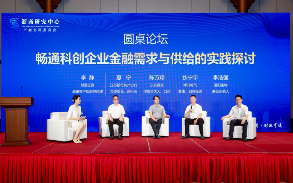 江苏银行杭州分行党委委员、副行长夏宁,杭州东方嘉富资产管理有限公司创始合伙人、CEO陈万翔,博菲电气股份有限公司董事、副总经理狄宁宇先生,杭州皓阳生物技术有限公司创始人李浩强参与圆桌论坛,围绕“畅通科创企业金融需求与供给的实践探讨”展开热烈讨论,并结合各自行业背景分享了对金融助力新质生产力发展的见解和路径。