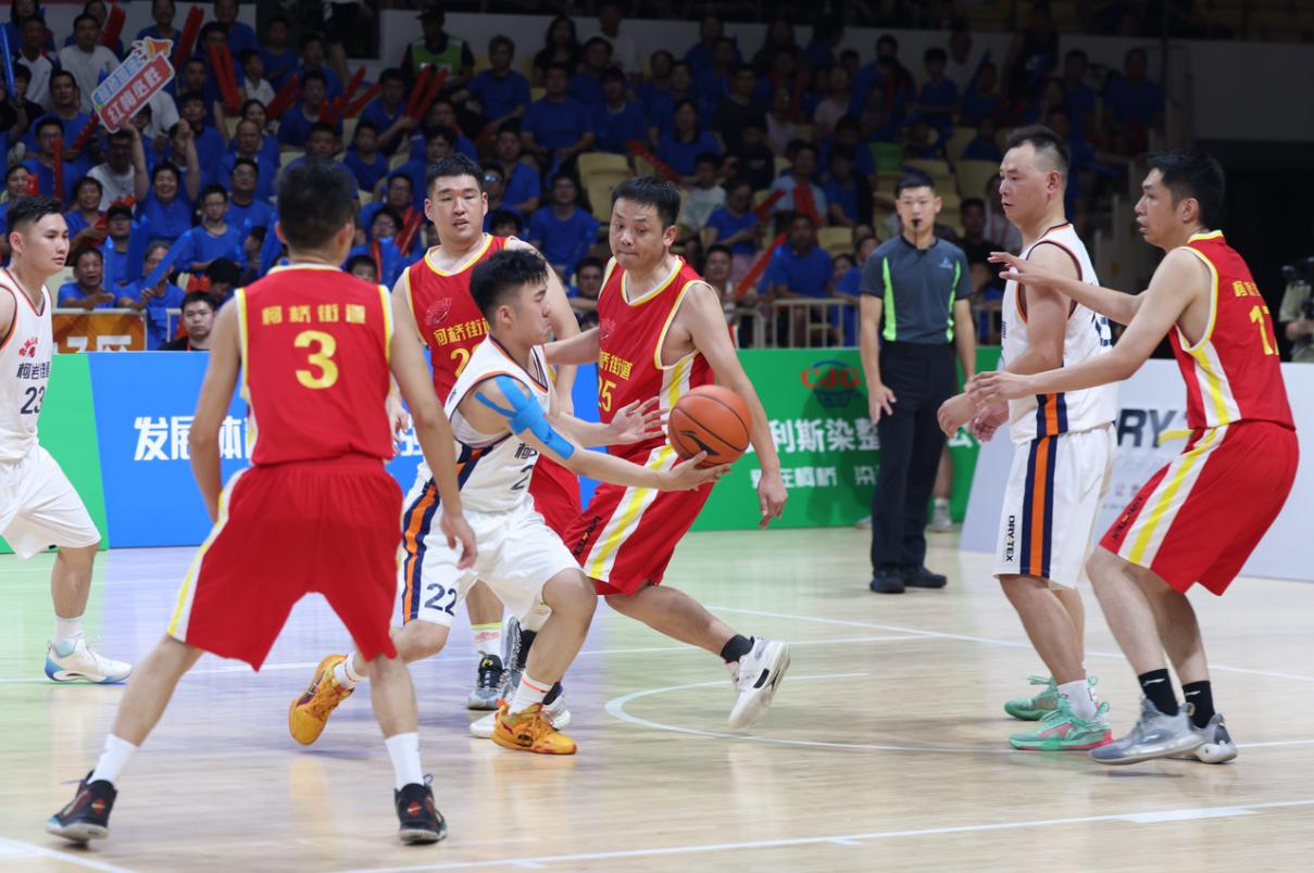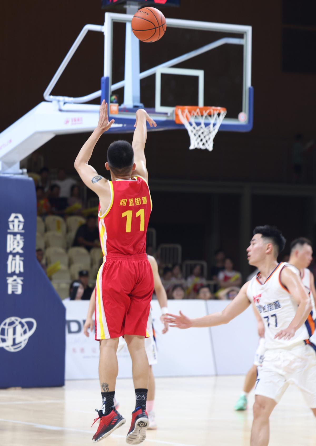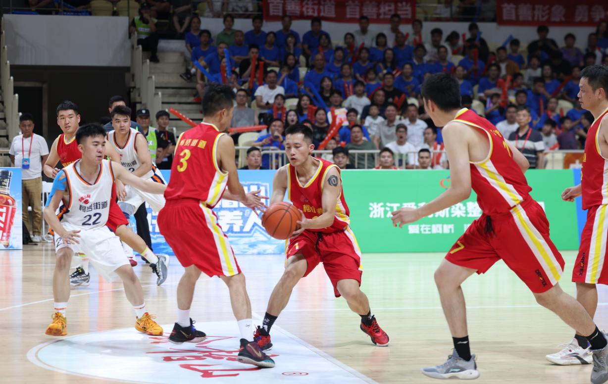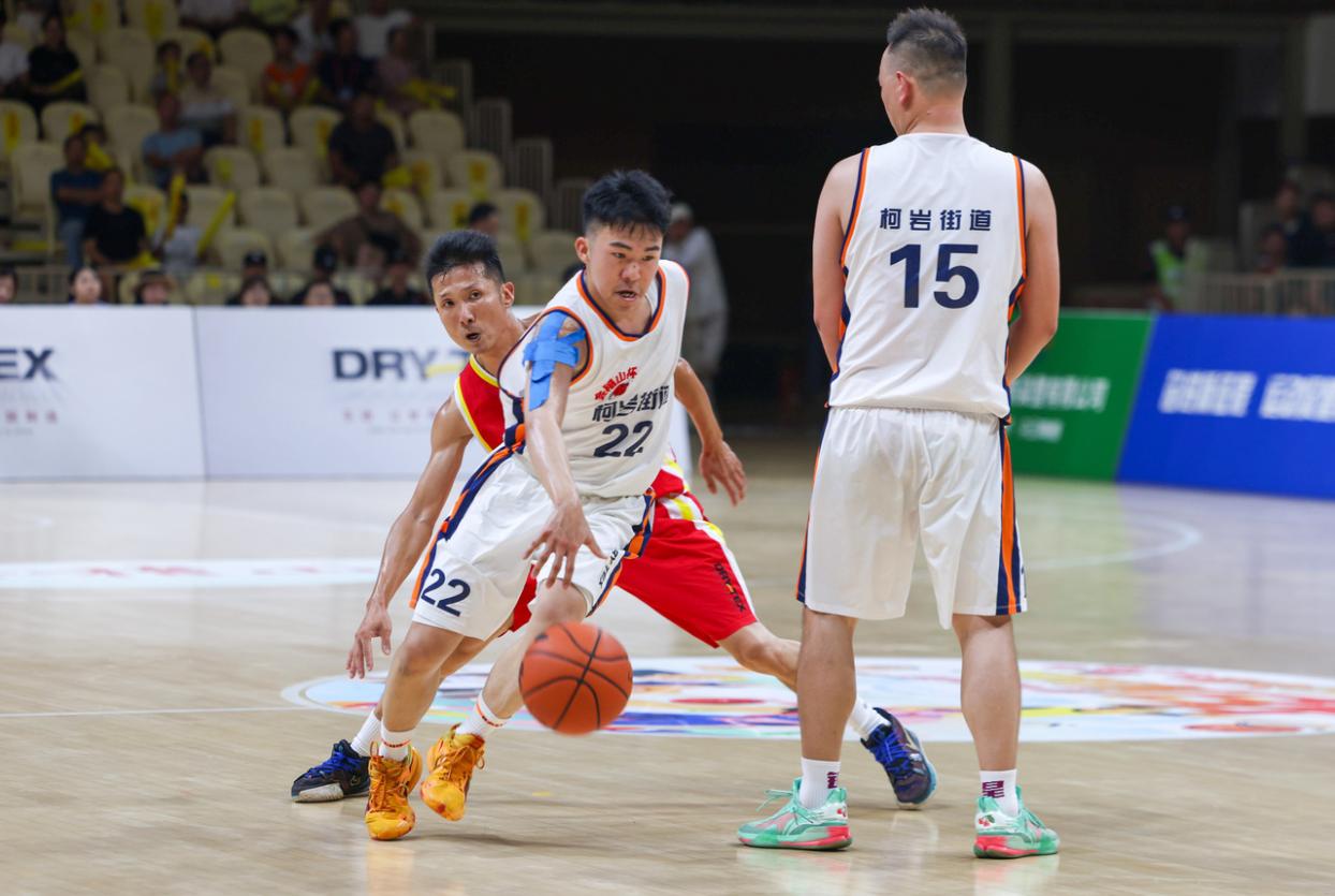 晚上7时35分,随着一声哨响,浙江稠州金租男篮队长吴前亮相为进入决赛的两支球队——柯岩街道信心居队与柯桥街道红梅社区队开球。
