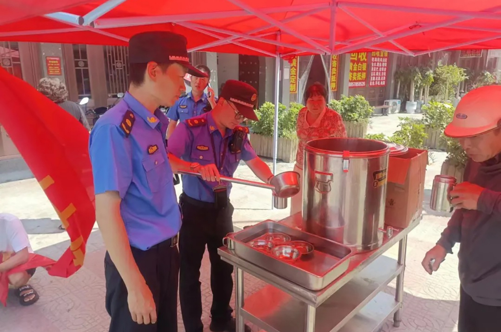 在龙湾区沙城街道七二村,沙城执法中队、社区工作人员和志愿者周末一大早便在茯茶点位上支起帐篷摆开长桌,清洗杯具,开始烧制茯茶。大家为路过的环卫工、快递员等户外作业人员和路人递上一杯杯消暑茯茶,送上一份夏日清凉。