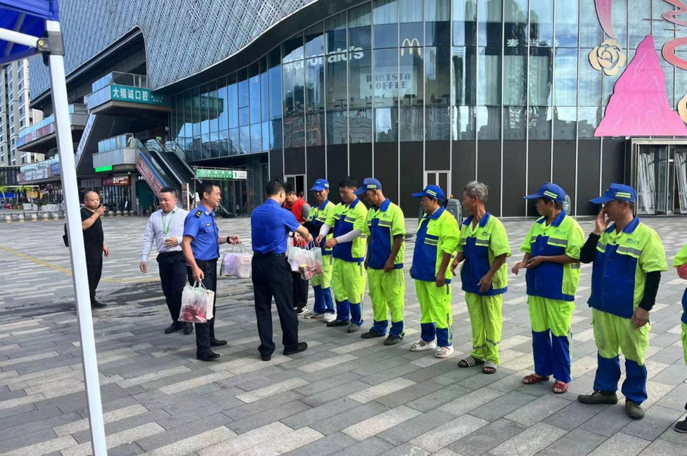 龙湾区综合行政执法局机关第四党支部、蒲州中队党支部联合温州新城吾悦商业管理有限公司,将洗漱用品、水果、饮料等慰问品送到每一个环卫工人代表的手中,并向坚守在高温下的环卫工人致以感谢和问候。