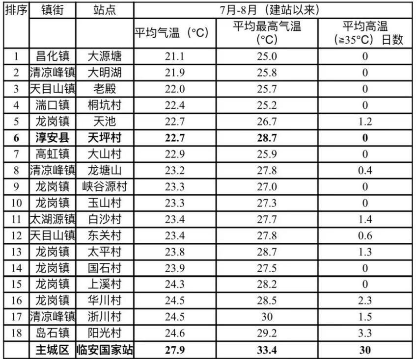 为统计临安适合暑期避暑游玩区域的气温特点,临安区气象局气象服务中心对杭州地区上千个气象监测站点历年(建站以来)来7月、8月的天气数据进行比对发现,杭州全市7-8月平均气温最低的18个站点中,临安占17个。