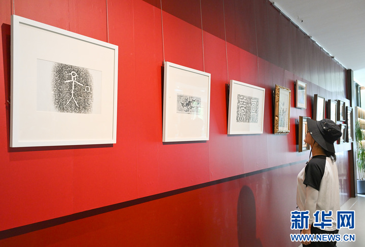 这是在浙江台州仙居县白塔镇上叶村仙居岩画艺术中心内展出当地岩画拓片(7月28日摄)。新华社记者 李贺 摄