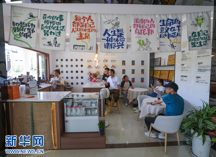 7月30日,在建德市三都镇创业陪跑空间刚开业的村咖“叁者耳”内,通过三都镇“乡村梦想家”人才项目引进的青年创客曾马境(左一)正在忙碌地为游客制作咖啡。新华社记者 徐昱 摄