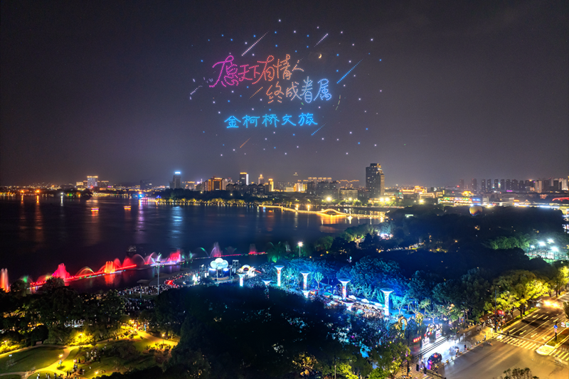 在瓜渚湖公园主活动区,由多巴胺音悦区、多巴胺引力区、多巴胺社交区、多巴胺派对区、多巴胺影音区、多巴胺水上体验区六大主题场景活动上演。作为七夕夜的重头戏,无人机表演秀现场,1000架无人机不断变换阵型点亮柯桥夜空。十组柯桥特色的文字和图案内容,结合舞台灯光和音乐喷泉,为市民游客带来了一场科技与文化艺术交融的视觉盛宴。而在飞行音乐会现场,多支乐队热力开唱。