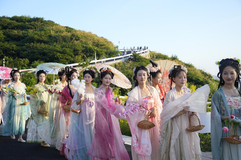 在七夕这样的传统节日里,少不了“中式浪漫”。花鸟岛设立了汉服体验项目,准备了50多套来自不同朝代的汉服。该项目包括衣物租赁、簪花、化妆等一条龙服务。来自上海的李女士选了一件蓝色的明制汉服。“花鸟岛和汉服很搭,赶在周末特地来打卡拍照。”李女士说。