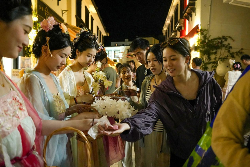 此外,活动现场还设立了心动市集,花神们化身红娘为来往的游客送上红绳和喜饼。集市不仅提供各类小吃,还有花鸟特色文创产品。