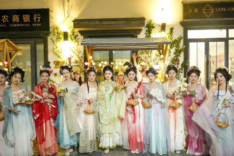 傍晚,迎来了“鹊游花鸟”花车巡游。着华服,尊古礼,兴华夏礼典,弘扬传统文化。参与花车巡游的人们身着汉服,展示十二花神与月老王婆的风采,游客们可以近距离观赏传统与现代结合的场面,感受跨越千年的浪漫和甜蜜,品味充满文化底蕴的浪漫盛宴。