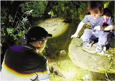白天观鸟,夜晚则是调查两栖爬行动物的时间。夜幕降临后,调查队伍转至莪山畲族乡,每人头上都佩戴上了探照灯,寻找调查的主要物种——蛙和蛇。“在一个未枯竭的小水沟旁,蛙鸣声阵阵,我们通过声音辨别出其中有泽陆蛙、小弧斑姬蛙、弹琴蛙等,一只布氏泛树蛙还突然跳到了我们一位调查员的手臂上。”工作人员说。