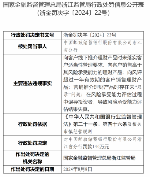 8月14日,国家金融监督管理总局浙江监管局行政处罚信息公开表(浙金罚决字〔2024〕22号)显示,中国邮政储蓄银行股份有限公司浙江省分行存在向客户线下推介理财产品时未落实客户适当性管理要求,向客户销售高于其风险承受能力的理财产品;向风评超过一年有效期的客户销售理财产品;营销推介理财产品时存在未“双录”问题;在风险承受能力评估过程中误导投资者,导致风险承受能力评估结果失真等违法违规事实。