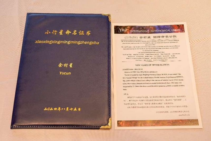 8月15日,在第二个全国生态日之际,浙江省湖州市安吉县天荒坪镇余村收到了一份来自太空的礼物。经国际天文学联合会小天体命名委员会批准,将编号为215458号的小行星被命名为“余村星”。“余村”的名字正式进入璀璨星空,传播中国生态文明的小行星将在太空闪耀。