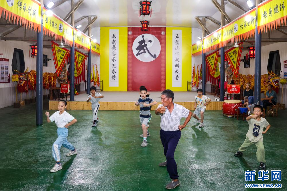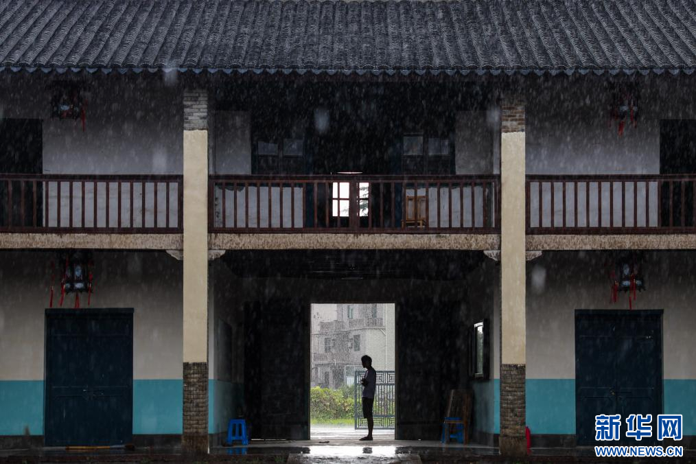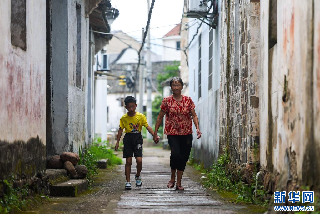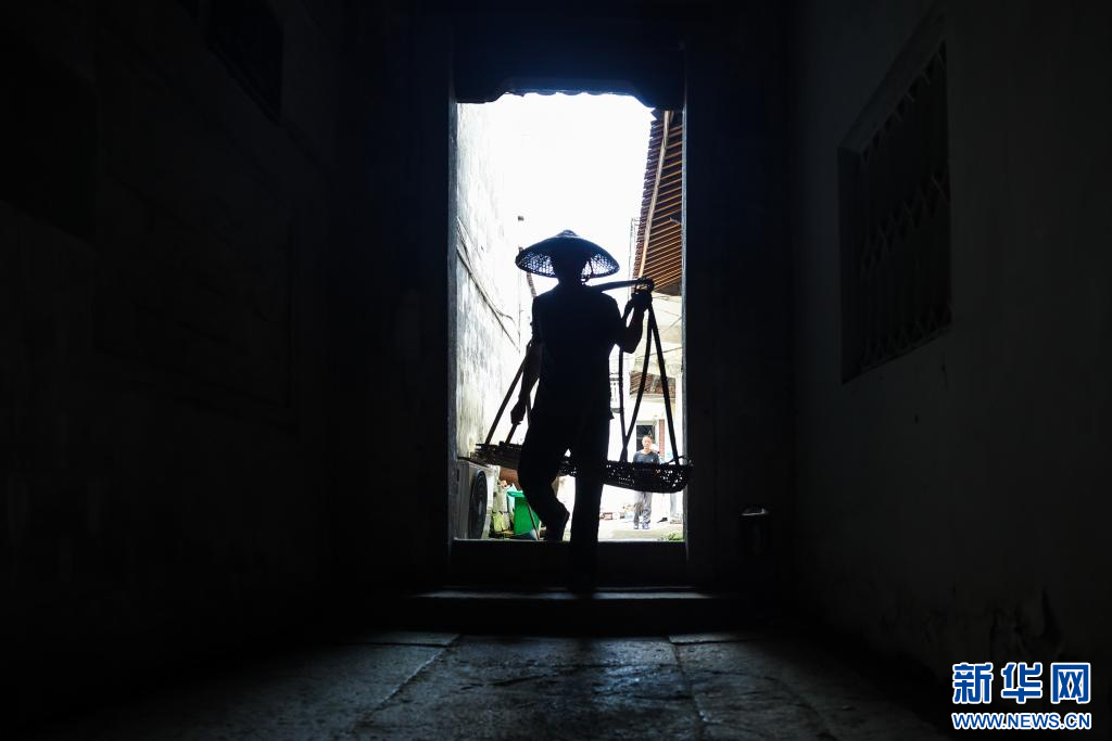 8月14日,诸暨市赵家镇花明泉村村民在何燮侯故居内挑担行走。