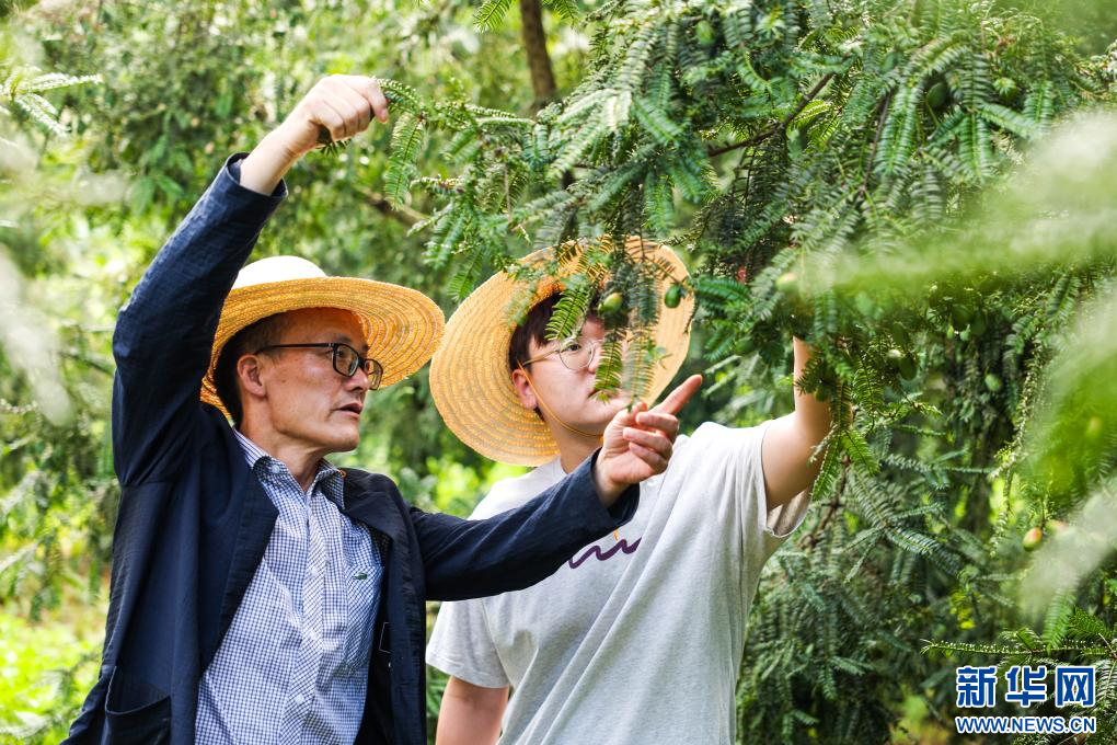 8月15日,诸暨市赵家镇花明泉村村民何伟录(左)与儿子何铁建查看自家香榧树果实的生长情况。