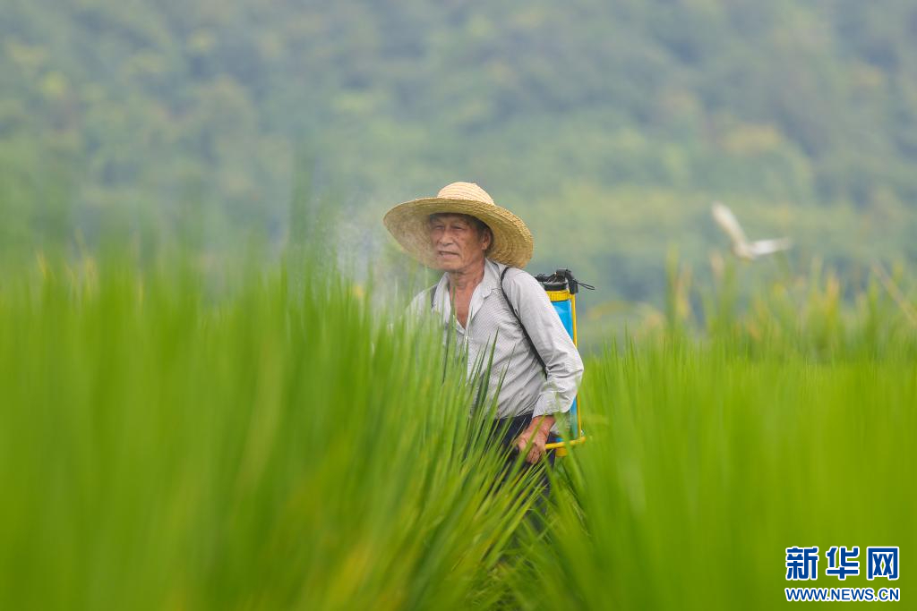 8月14日,诸暨市赵家镇花明泉村村民何新云在稻田内喷洒农药。