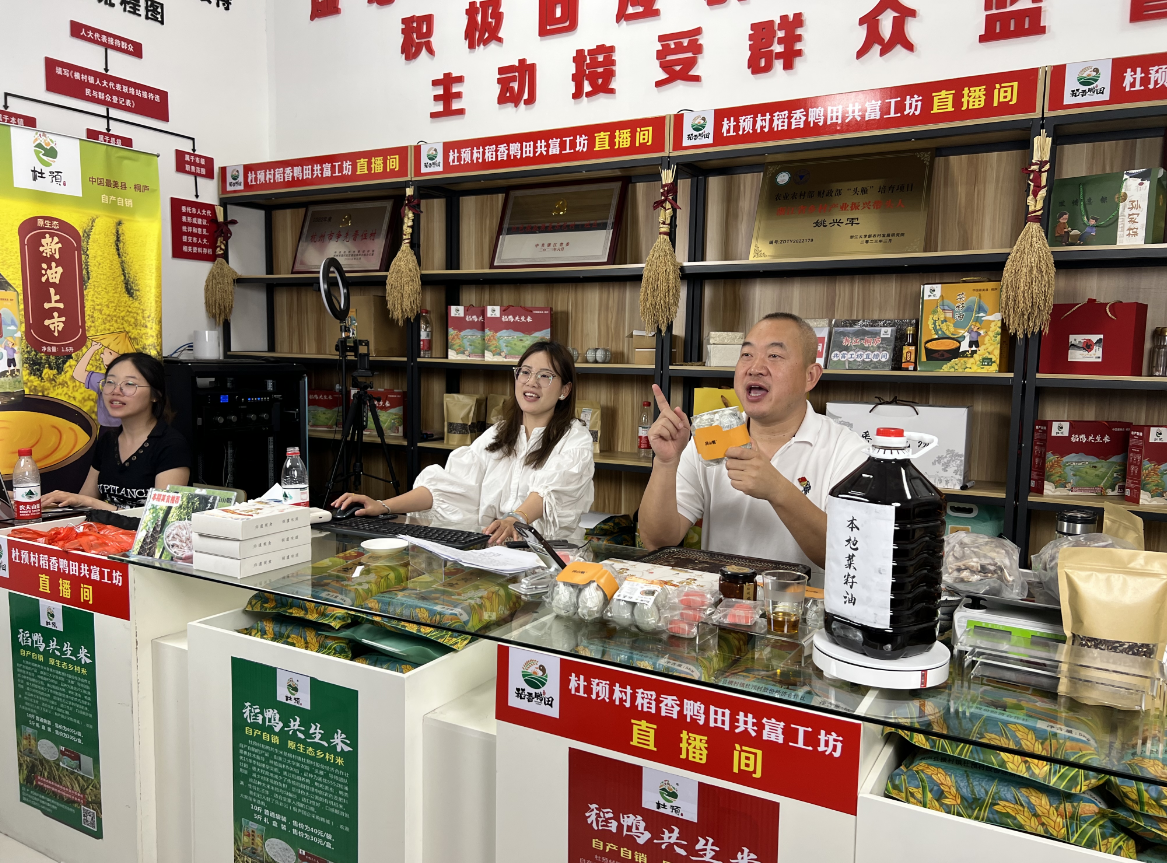 不会直播怎么办?在很长一段时间里,姚兴军每天认真观看同类型、同赛道的直播间,仔细研究。起初,直播间的“粉丝”少得可怜,但他依旧用心做好各项工作,开播前梳理产品类目、特点及介绍顺序,直播中积极引导“粉丝”互动,下播后抓紧时间复盘直播数据,分析问题,找出解决方案。经过几个月的努力,共富工坊直播间已有订单量2000笔,成交额12万元左右。同时杜预村“稻香鸭田”农产品线下共富集市,还售卖村集体自产自销的生态菜籽油及稻鸭共生米,为村集体经营性收入增加35万元。