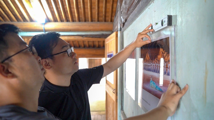 省级文化特派员朱海伟(右一)在温岭市石塘镇里箬村布置摄影展,展出内容为杭州亚运会期间的摄影作品,以丰富村里文化业态。