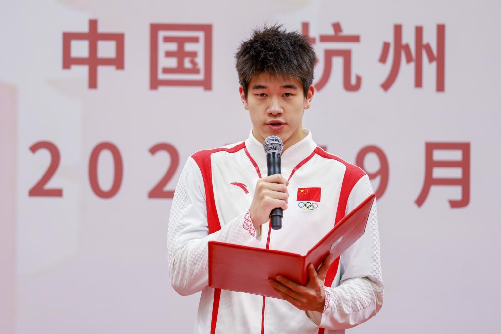 9月3日,游泳运动员潘展乐在活动中领读“体育力量 青春榜样”倡议书。新华社记者 江汉 摄