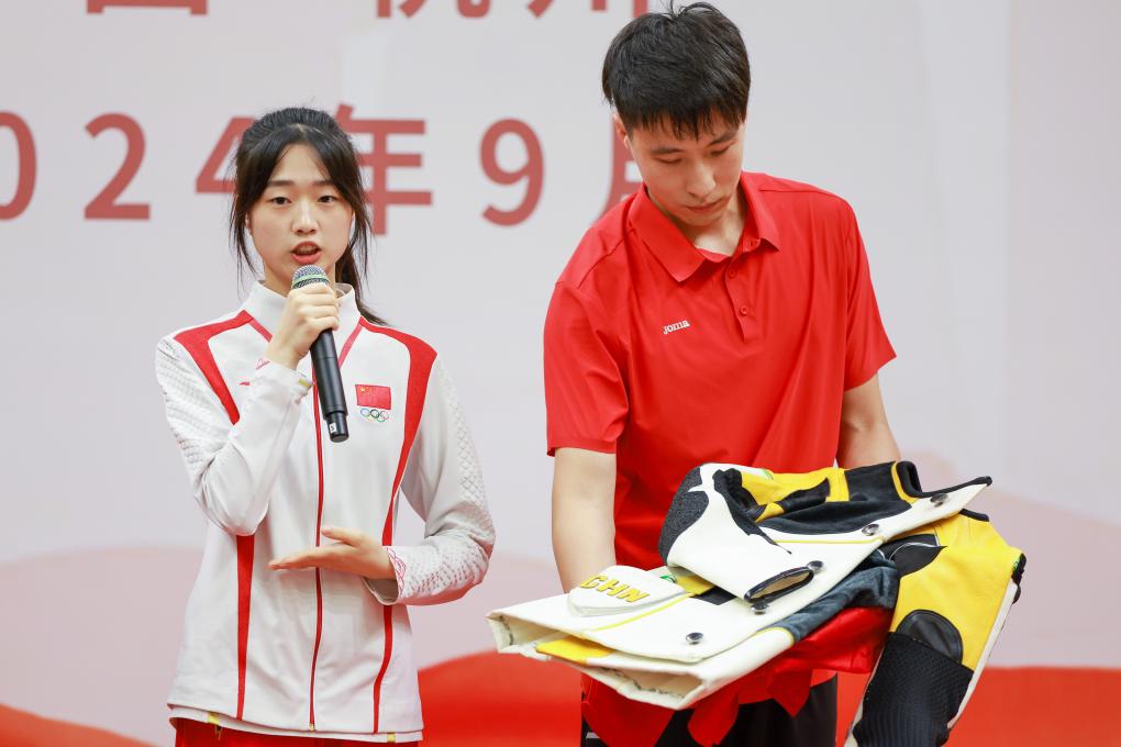 9月3日,射击运动员黄雨婷(左)介绍自己捐赠的比赛服。新华社记者 江汉 摄