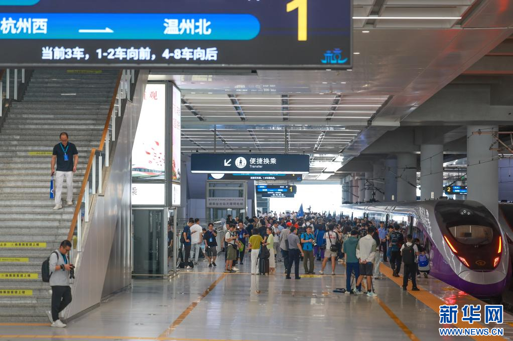 9月6日,从杭州西站开出的首发列车抵达温州北站。新华社记者 江汉 摄