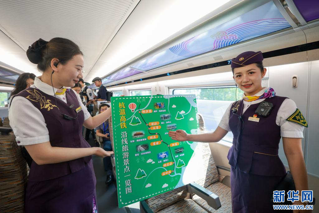 9月6日,杭州客运段工作人员在首发列车上介绍杭温高铁沿线旅游景点。新华社记者 江汉 摄