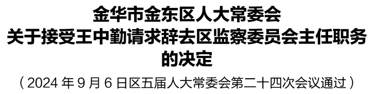 根据《中华人民共和国地方各级人民代表大会和地方各级人民政府组织法》《中华人民共和国监察法》《金华市金东区人民代表大会常务委员会任免国家机关工作人员办法》的有关规定,金华市金东区第五届人民代表大会常务委员会第二十四次会议决定:接受王中勤辞去金华市金东区监察委员会主任职务,报金华市金东区人民代表大会备案。