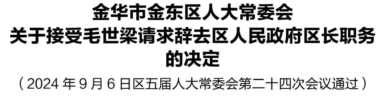 根据《中华人民共和国地方各级人民代表大会和地方各级人民政府组织法》《金华市金东区人民代表大会常务委员会任免国家机关工作人员办法》的有关规定,金华市金东区第五届人民代表大会常务委员会第二十四次会议决定:接受毛世梁辞去金华市金东区人民政府区长职务,报金华市金东区人民代表大会备案。