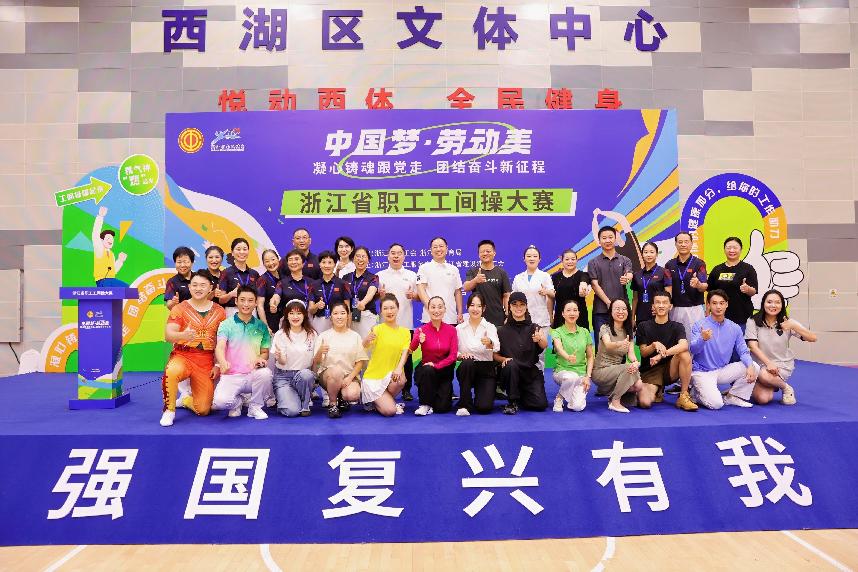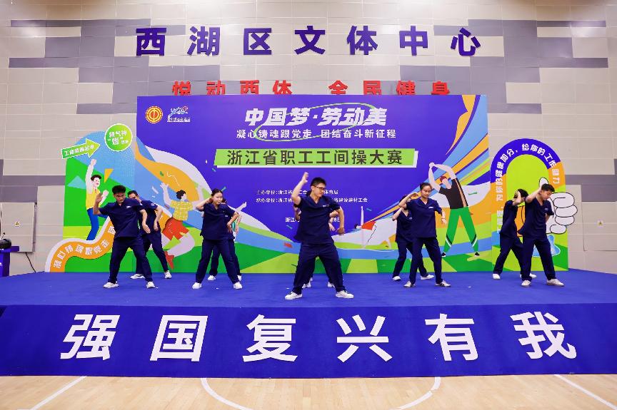 赛场上,灯光璀璨,各队伍轮番上阵,时而唯美悠扬、时而激情动感,在身体的律动下,风格各异的工间操,秀出了最美Style……9月8日,“中国梦·劳动美——凝心铸魂跟党走 团结奋斗新征程”浙江省职工工间操大赛在杭州市西湖区文体中心举行,来自全省11个地市及省级产业工会的16支队伍、280余人以精彩纷呈的工间操表演,唤醒活力因子,献上了一场视觉与心灵的双重文化大餐。
